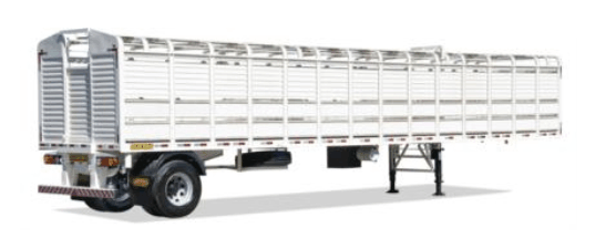 Caixa de carga em estrutura metálica fechada com laterais em polímero Tecno 5, com três compartimentos para divisão dos animais, portas elevadiças com abertura manual através de roldanas, trilho passadiço superior removível, escadas na frontal e na lateral do implemento, assoalho em compensado de 25mm de espessura com a superfície resinada.